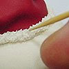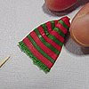 Faça um círculo com a massa vermelha e corte um pedaço dele. Use para fezer um cone. Coloqueno na cabeça do boneco e achate-o cuidadosamente.