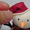 Com a massa laranja faça um cone para o nariz. Com a massa azul faça minúsculas bolinhas, para os olhos e use a esteca para fazer os furinhos que serão a boca.Use a extrusora para fazer pequenos rolinhos e disponha-os lado a lado alternando as cores vermelha e verde. Passe o rolo por cima para achatá-los e corte as pontas para que fiquem alinhadas, esse será o cachecol.