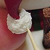 Com a massa branca, faça um pequeno rolinho e texturize com a esteca, coloque em volta do chapéu. Faça o mesmo com uma pequena bola e coloque-a na extremidade.